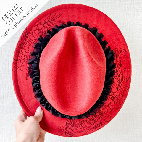 Celebrate the spirit of Día de los Muertos with a botanical brim that frames classic calavera details with elegant carnation-style florals and leaves. The design wraps smoothly around the brim to turn a simple felt...